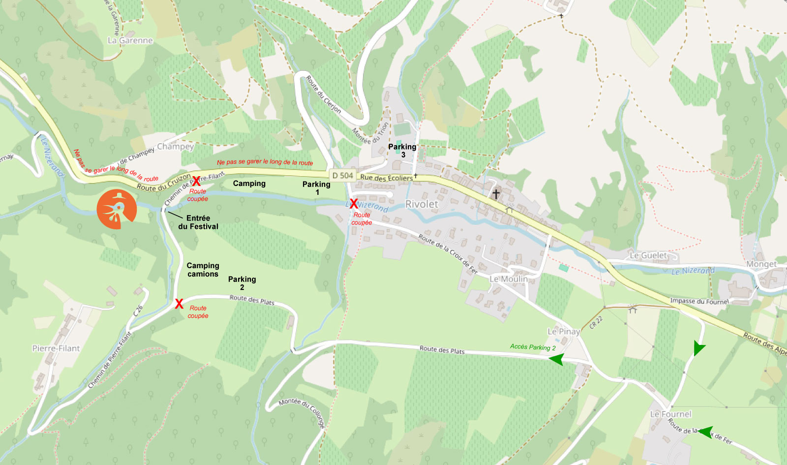 Prévoir une mini balade à pied, car il est difficile de se garer à proximité de l’entrée du festival. Les parkings voitures, motos et un accès pour les personnes à mobilité réduite sont signalés.